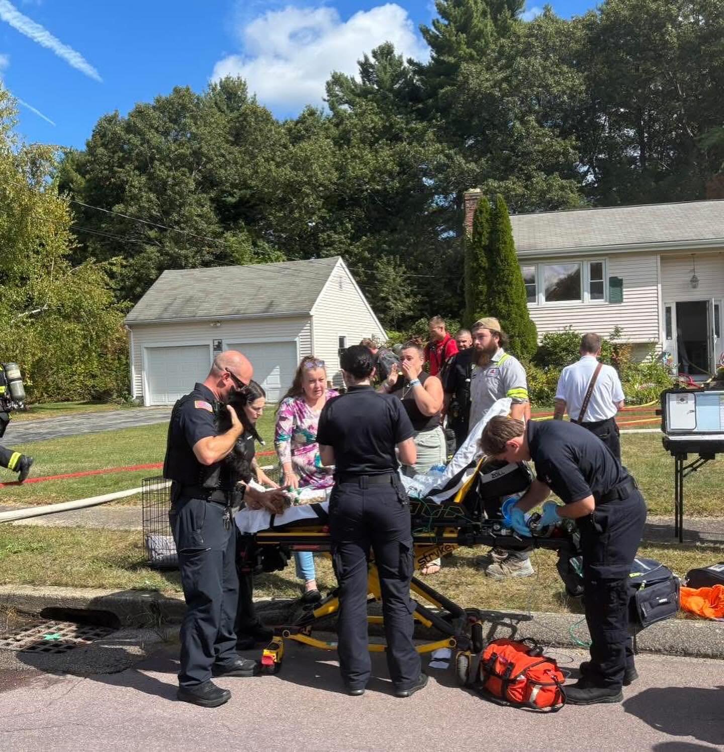 Officials said no residents were injured in the blaze, but several animals were trapped inside as heavy smoke filled the home. Firefighters, police officers, and animal control personnel from Wrentham — with support from Norfolk and Plainville crews — worked urgently to bring them out.